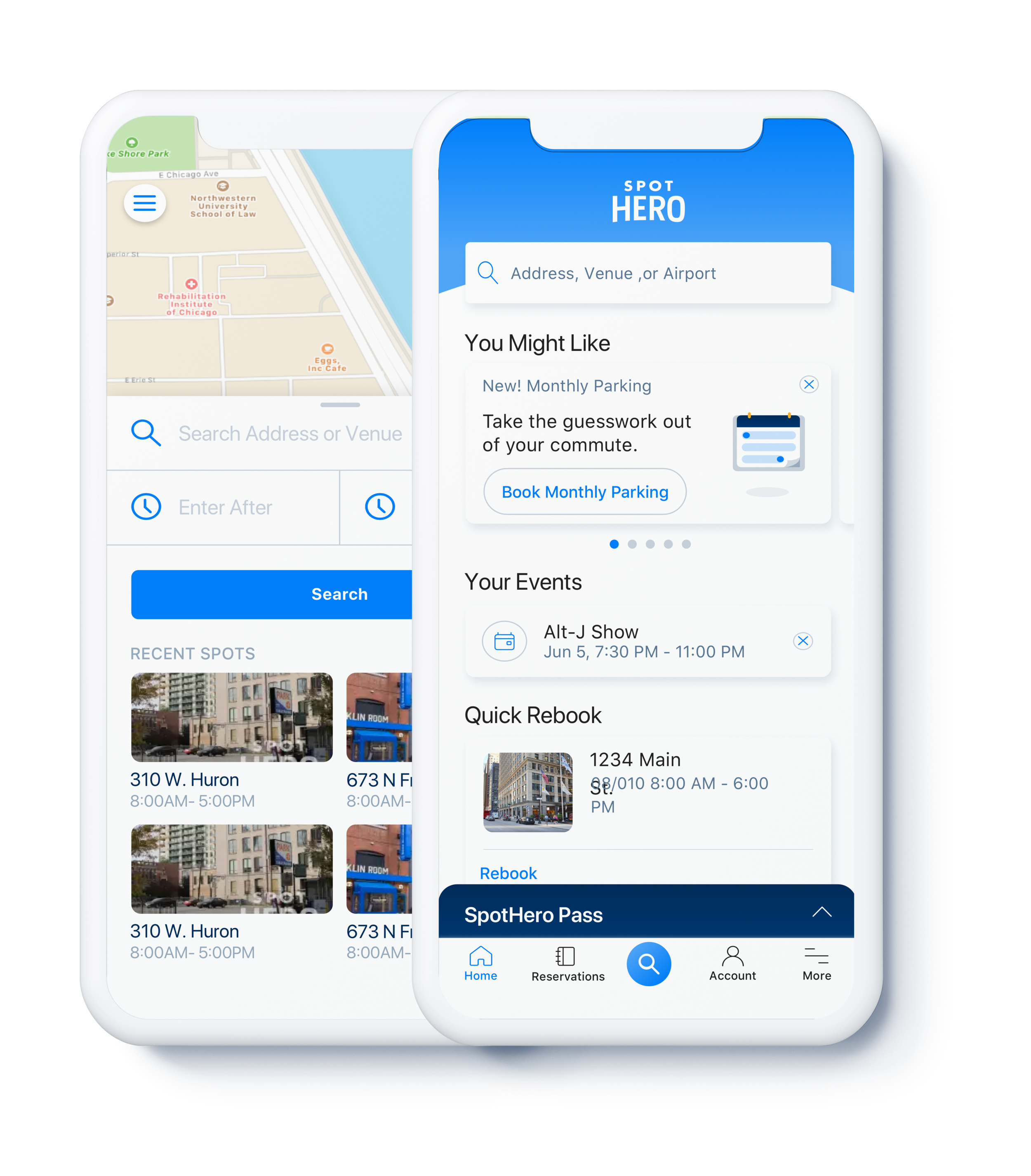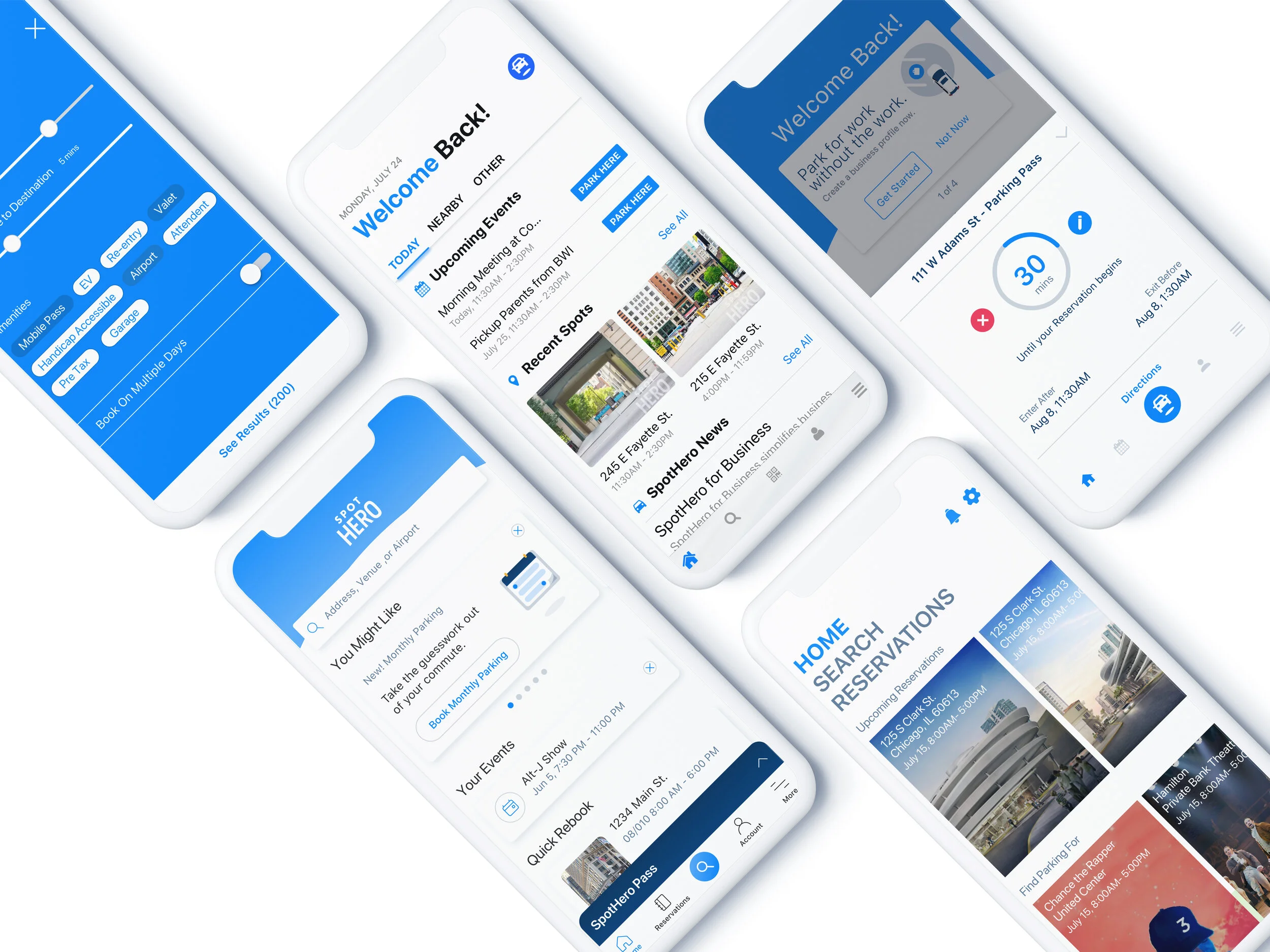 The SpotHero app was starting to grow, adding features created for specific drivers. We added: SpotHero for Business, to split your personal and work related parking expenses; Calendar Sync, to quickly find parking near your events at the times of your events; Commuter Benefits, so you can pay for parking with your tax free savings; and Power Booking, so you can book your parking for work all week in one click. We realized, that our old information architecture was no longer able to handle the load, and prevented us from creating a custom experience for each drivers’ needs.